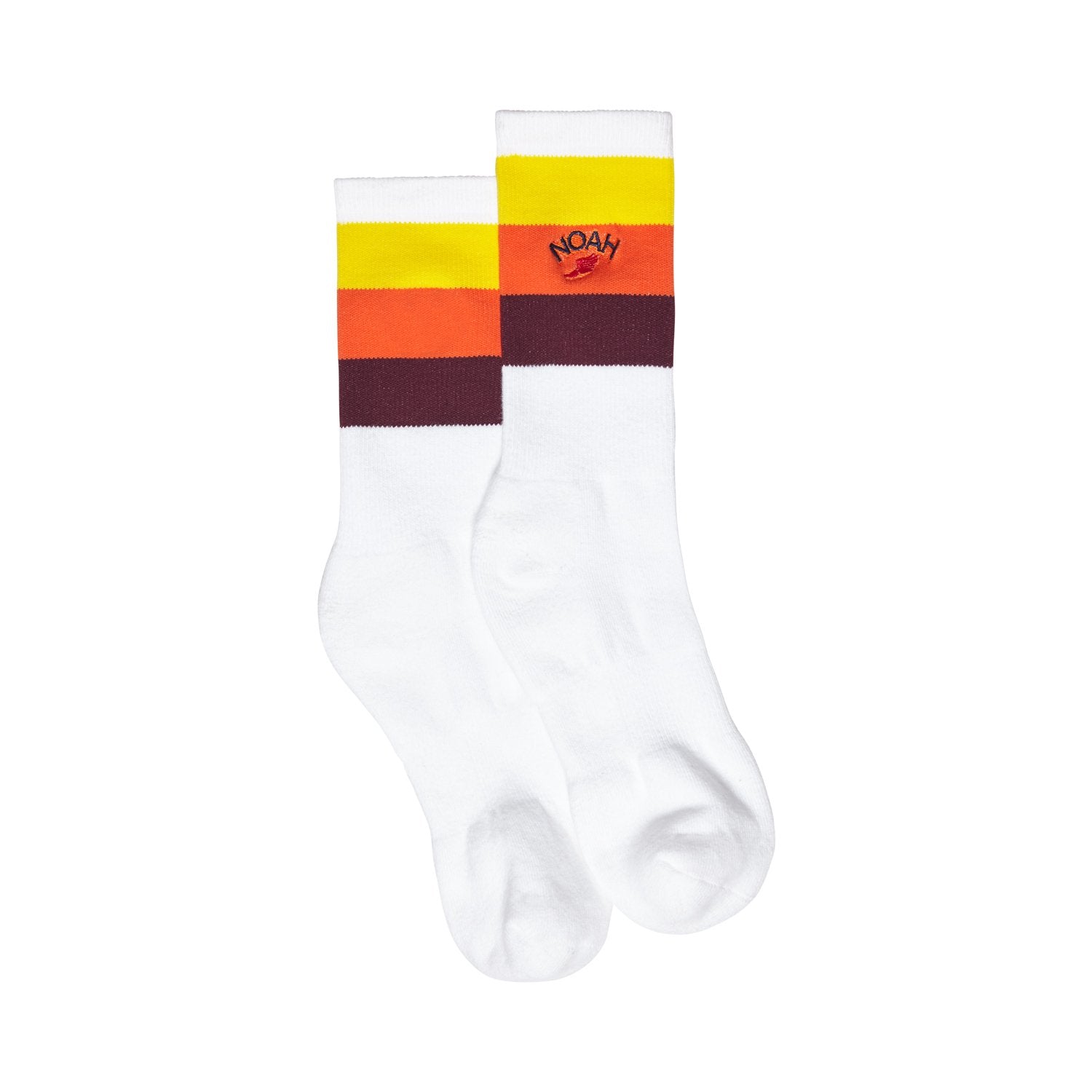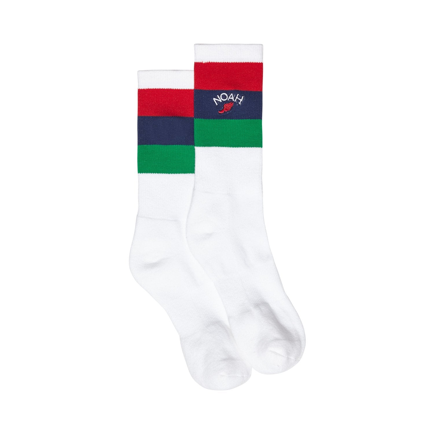 Made in USA. 75% cotton, 20% polyester, 3% nylon, 2% elastic. Crew sock with knit stripes and embroidered logo.