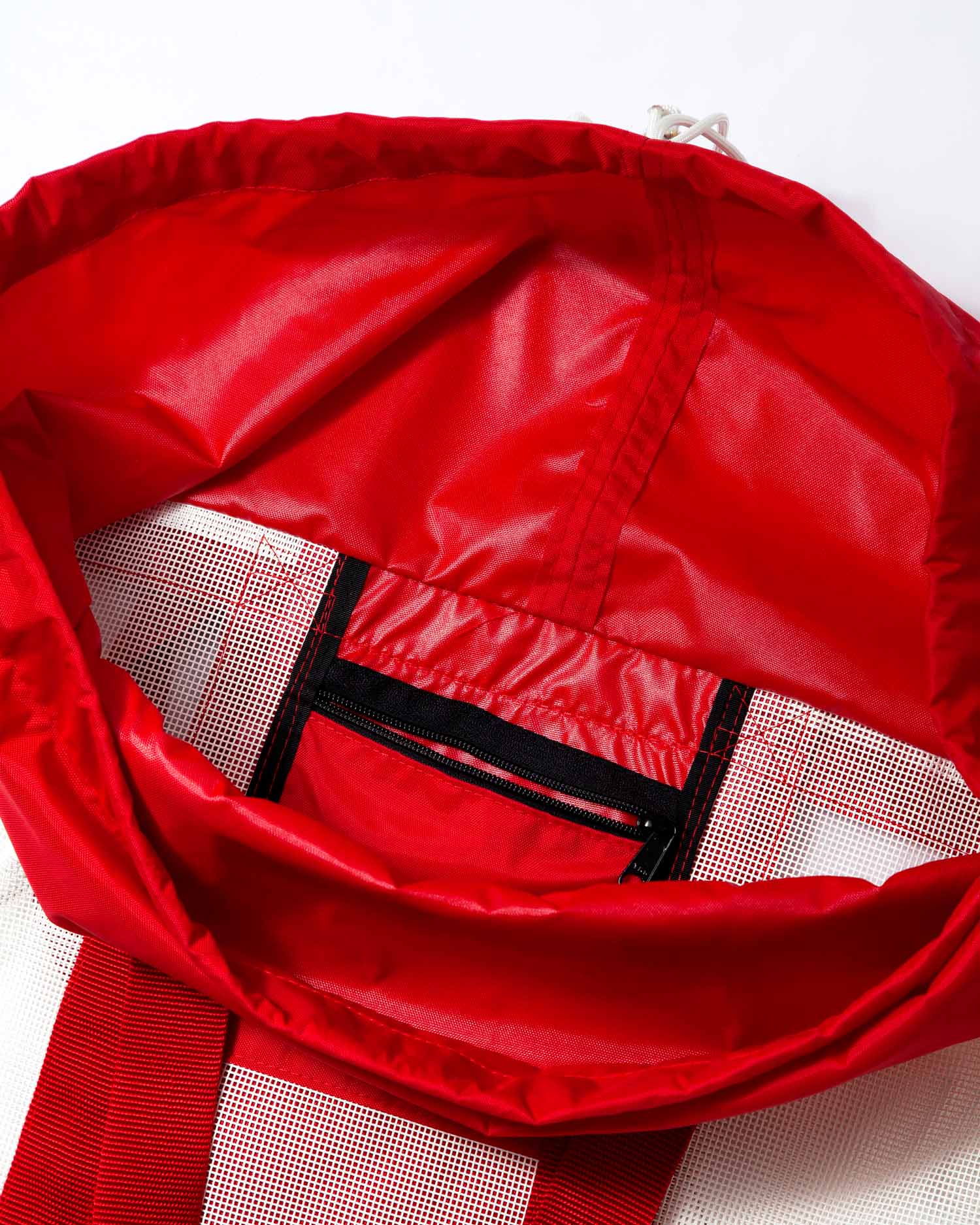Made in USA. 100% nylon with PU-coated mesh panels. Expandable top with drawstring closure and cord lock. Interior zip pocket. Woven label on side.