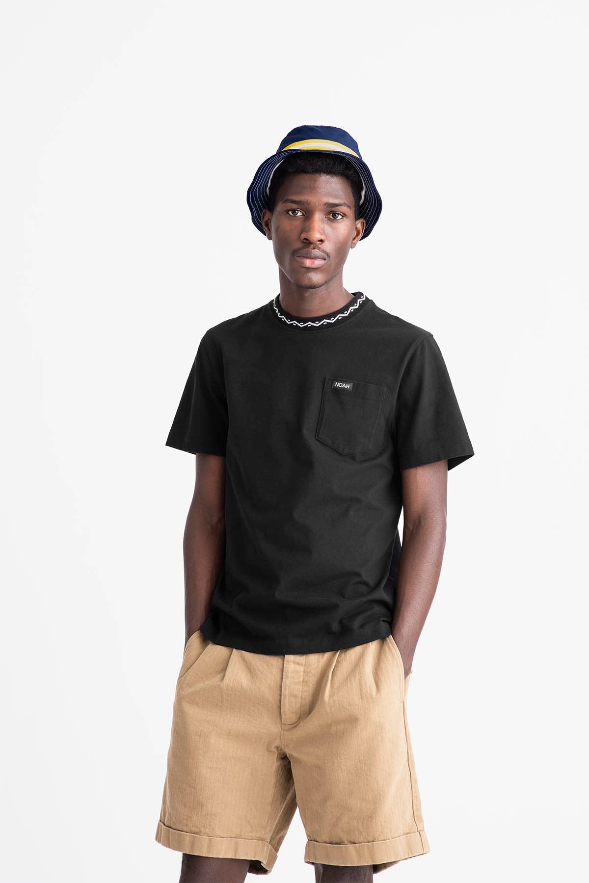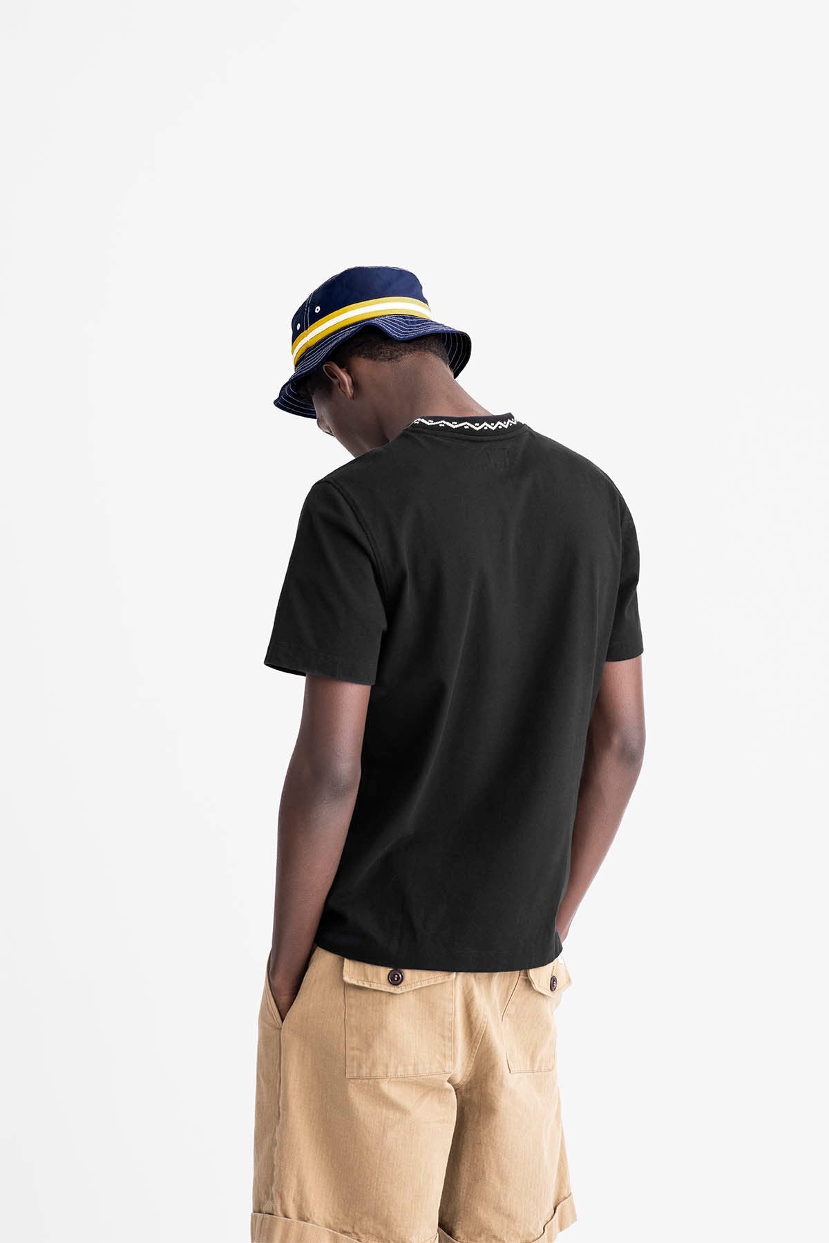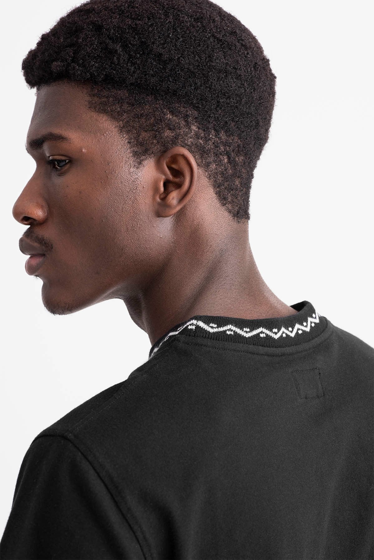 Made in Portugal. 100% cotton. Rib knit collar with jacquard pattern. Woven label on pocket.