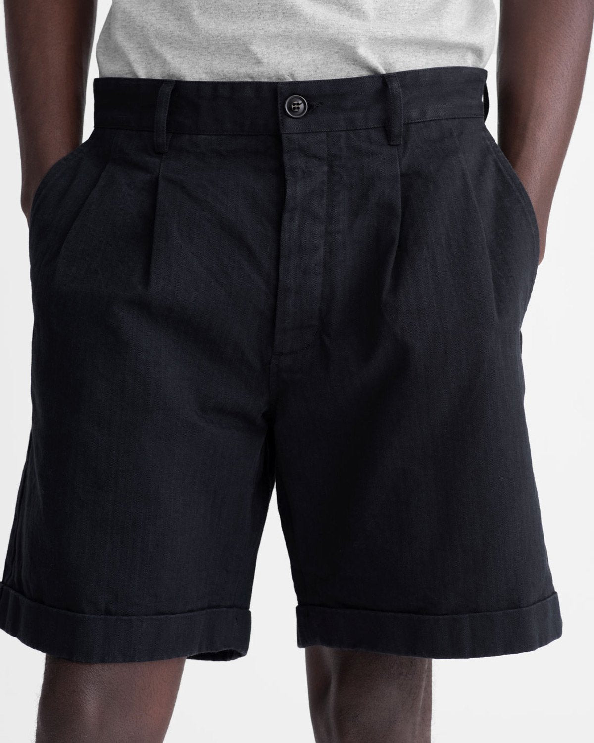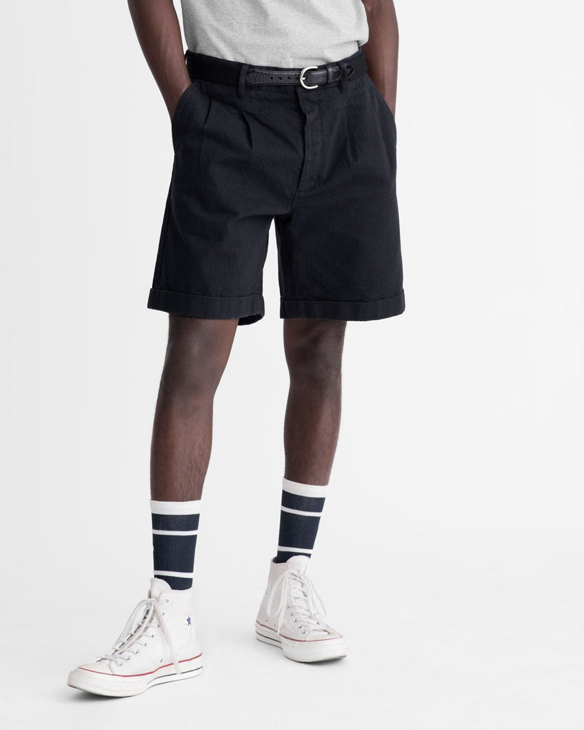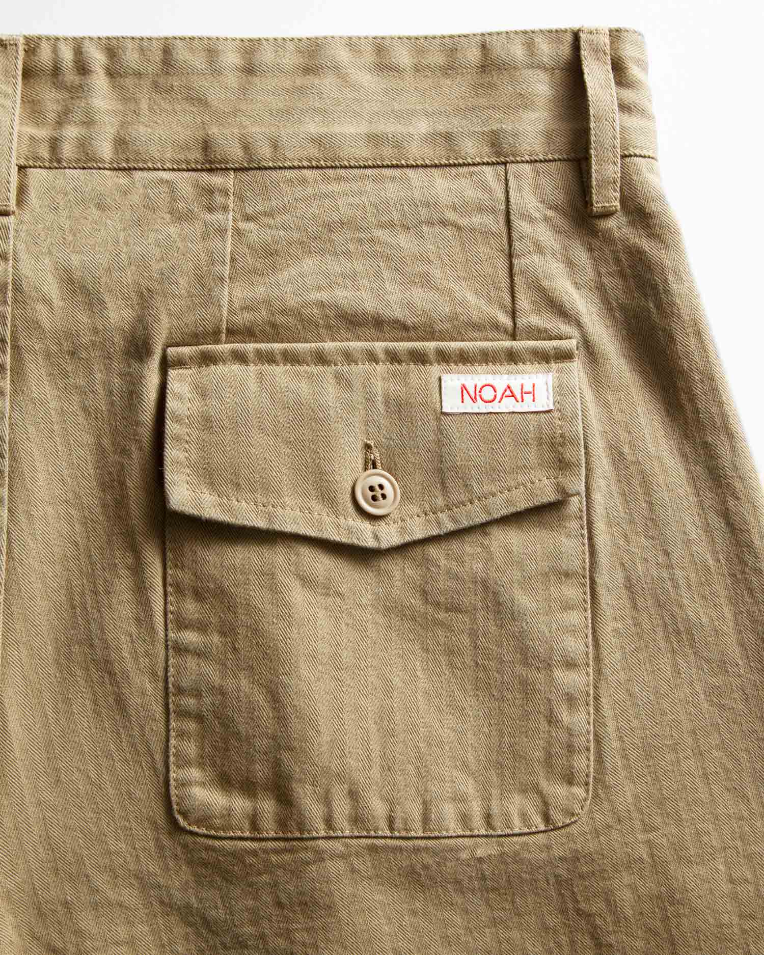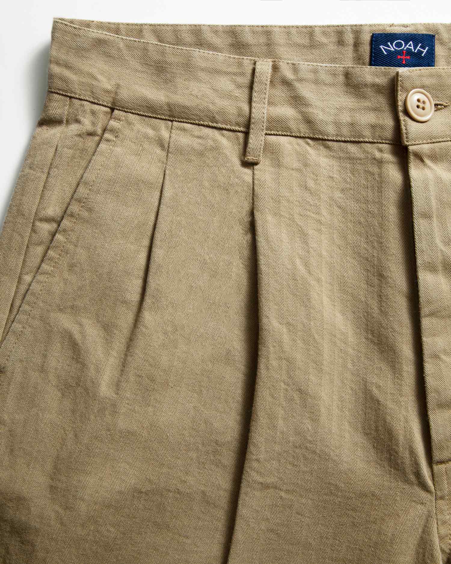 Made in Italy. 100% cotton, herringbone twill. Double-pleat front with cuffed hem, button fly, and button closure. Slash front pockets, flap back pockets with button closures. Woven label on back pocket.