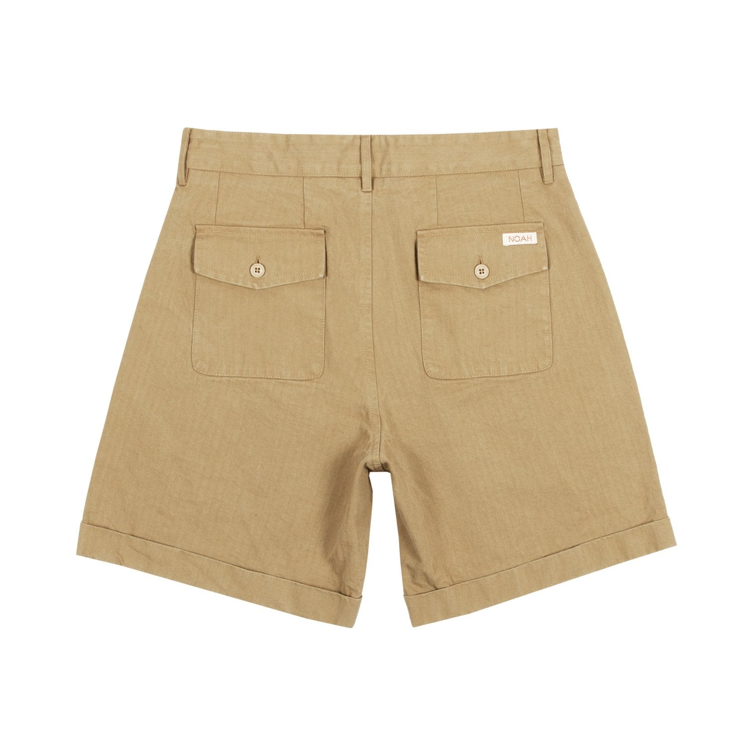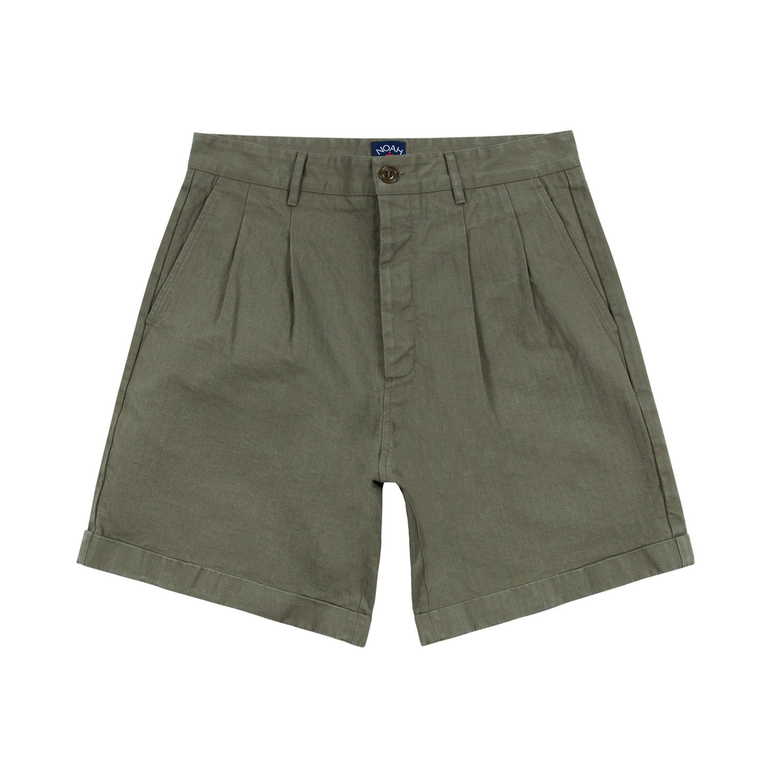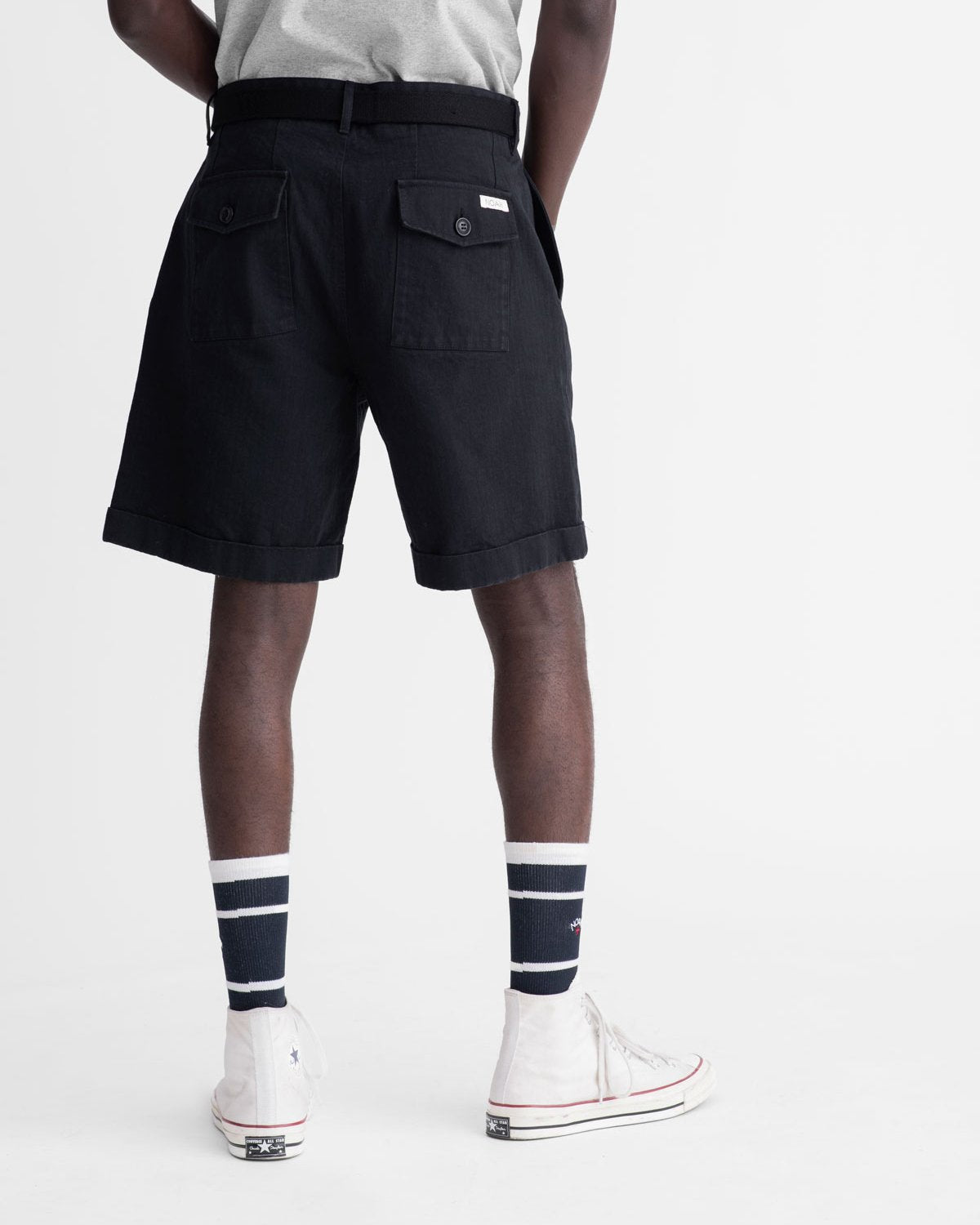 Made in Italy. 100% cotton, herringbone twill. Double-pleat front with cuffed hem, button fly, and button closure. Slash front pockets, flap back pockets with button closures. Woven label on back pocket.