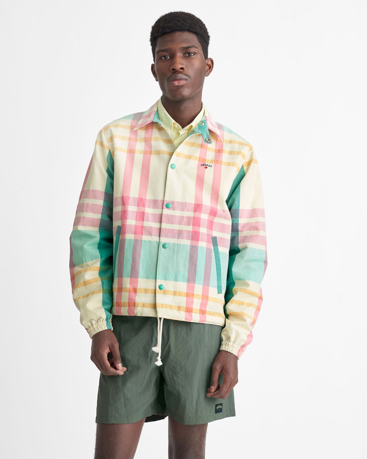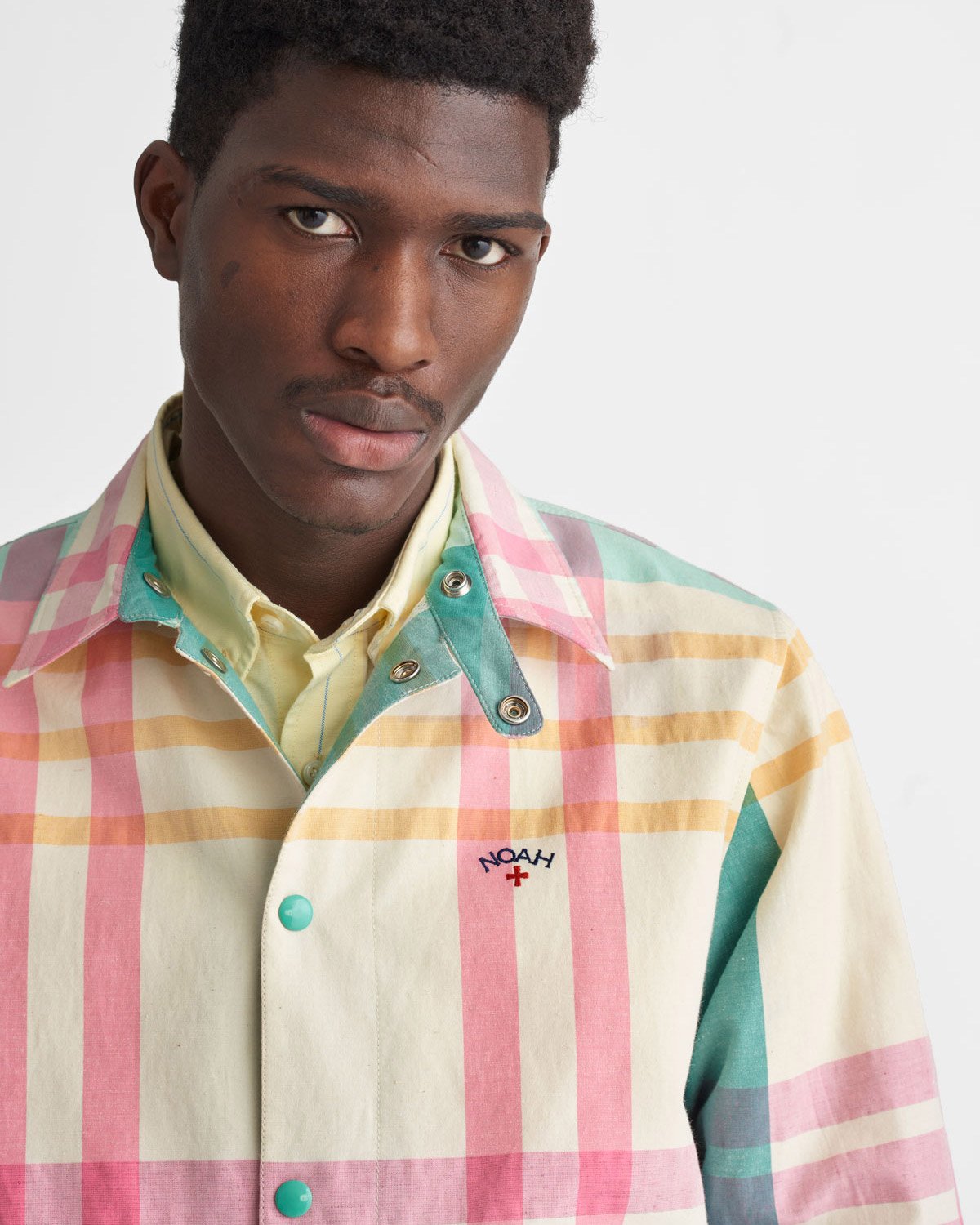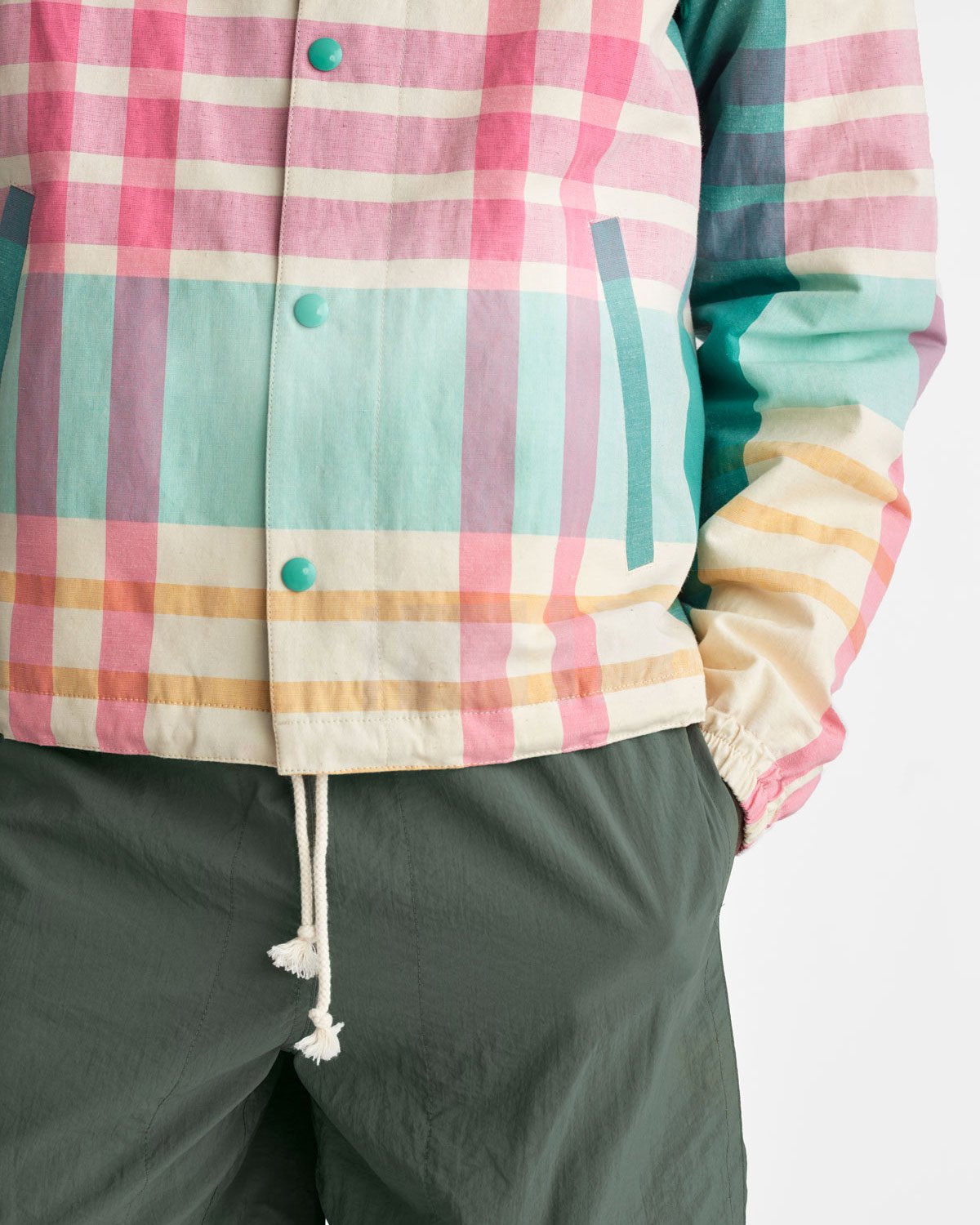 This summery Italian blend of cotton and linen comes from a mill that specializes in making dense but breathable fabrics and incorporating patterns more commonly found in shirting into more substantial materials. This one, which has a light, dry hand and a bit of nubby, irregular texture (thanks to its linen content), was too good not to develop into these custom madras prints.