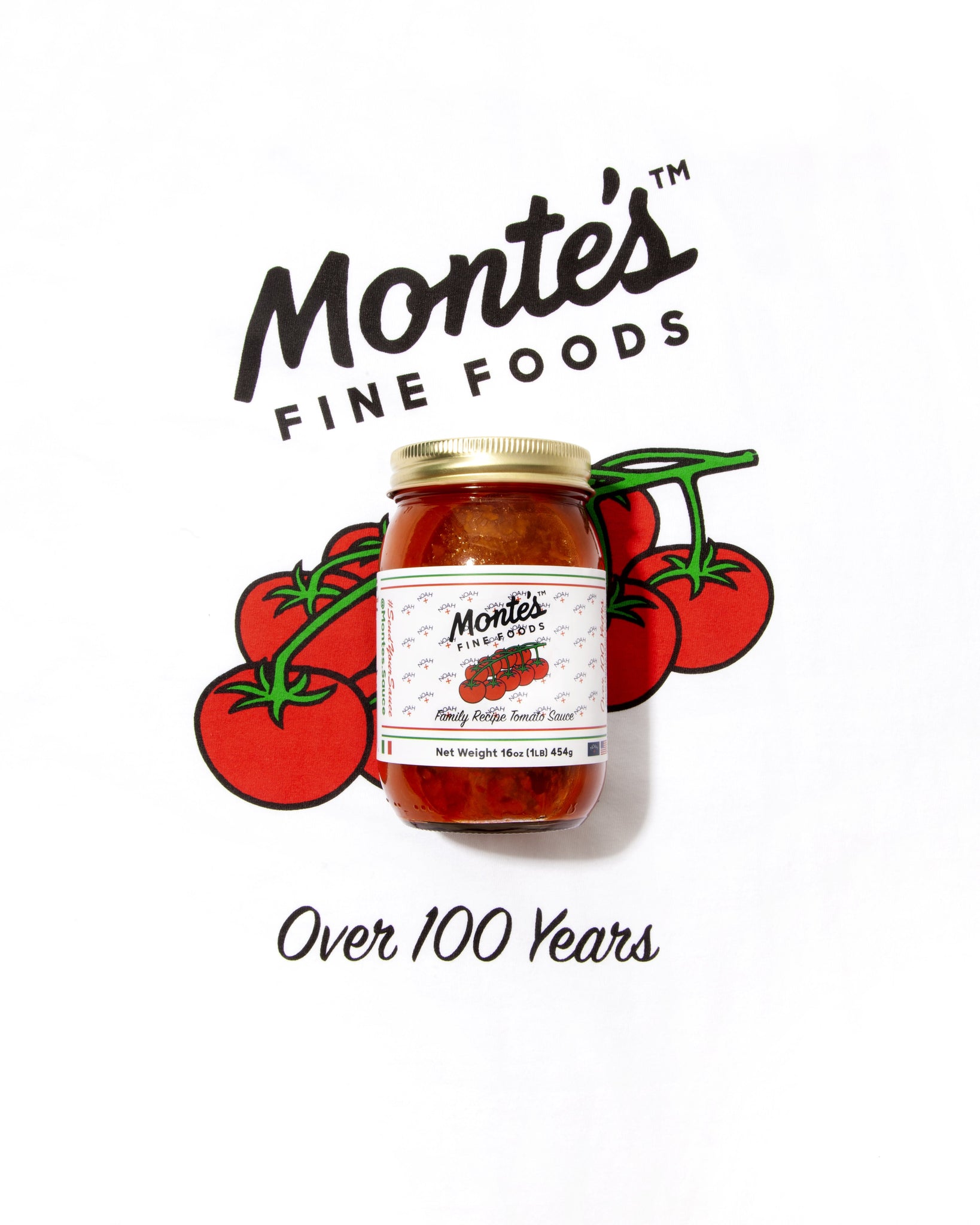 Made in Honduras, printed in USA. 100% cotton. Printed logo on front pocket, Monte's logo on sleeve and back. 16 oz jar of Monte's Family Recipe Tomato Sauce with co-branded label included with purchase of tee.