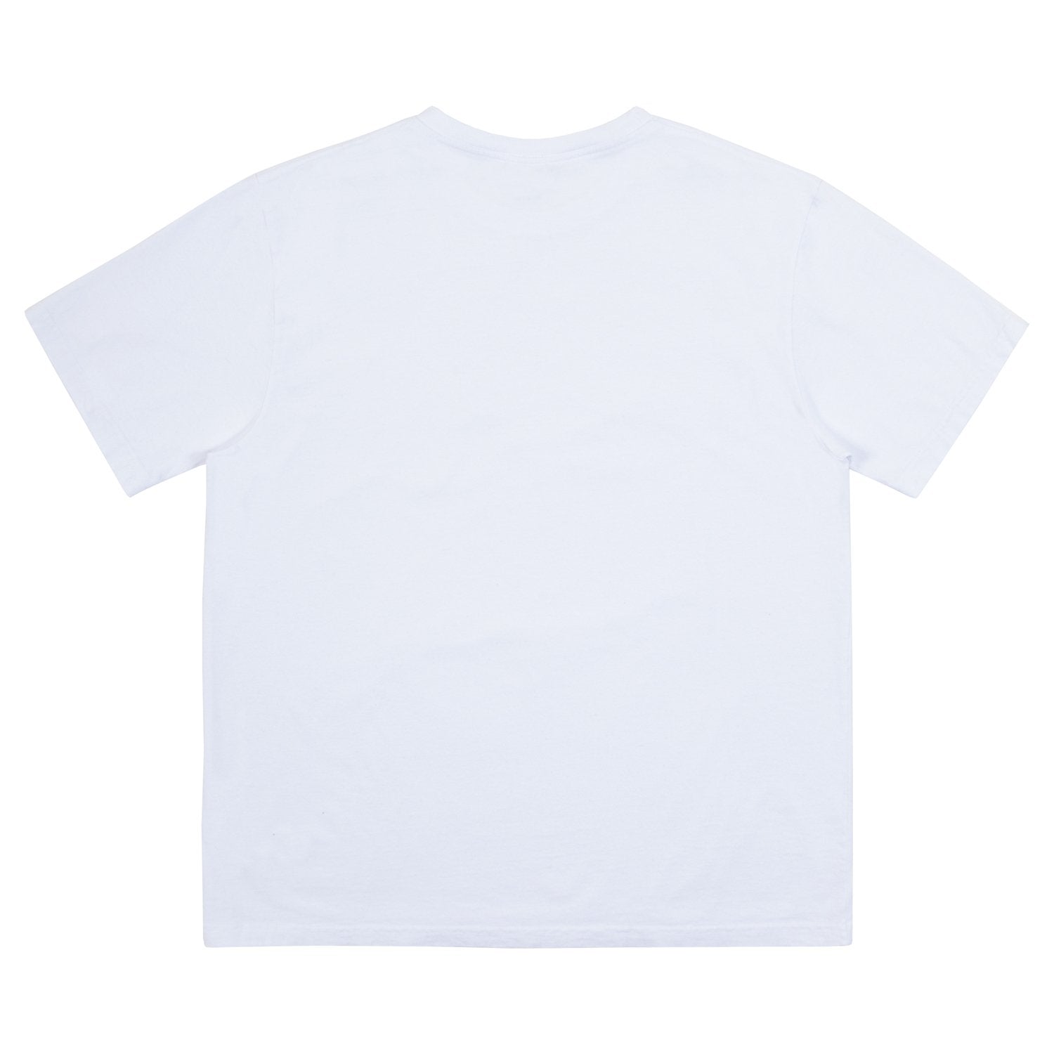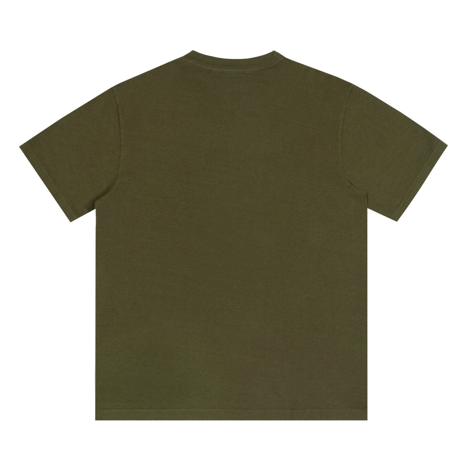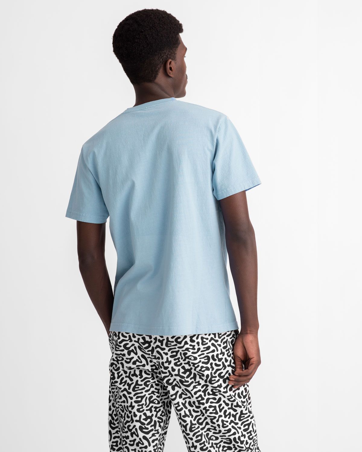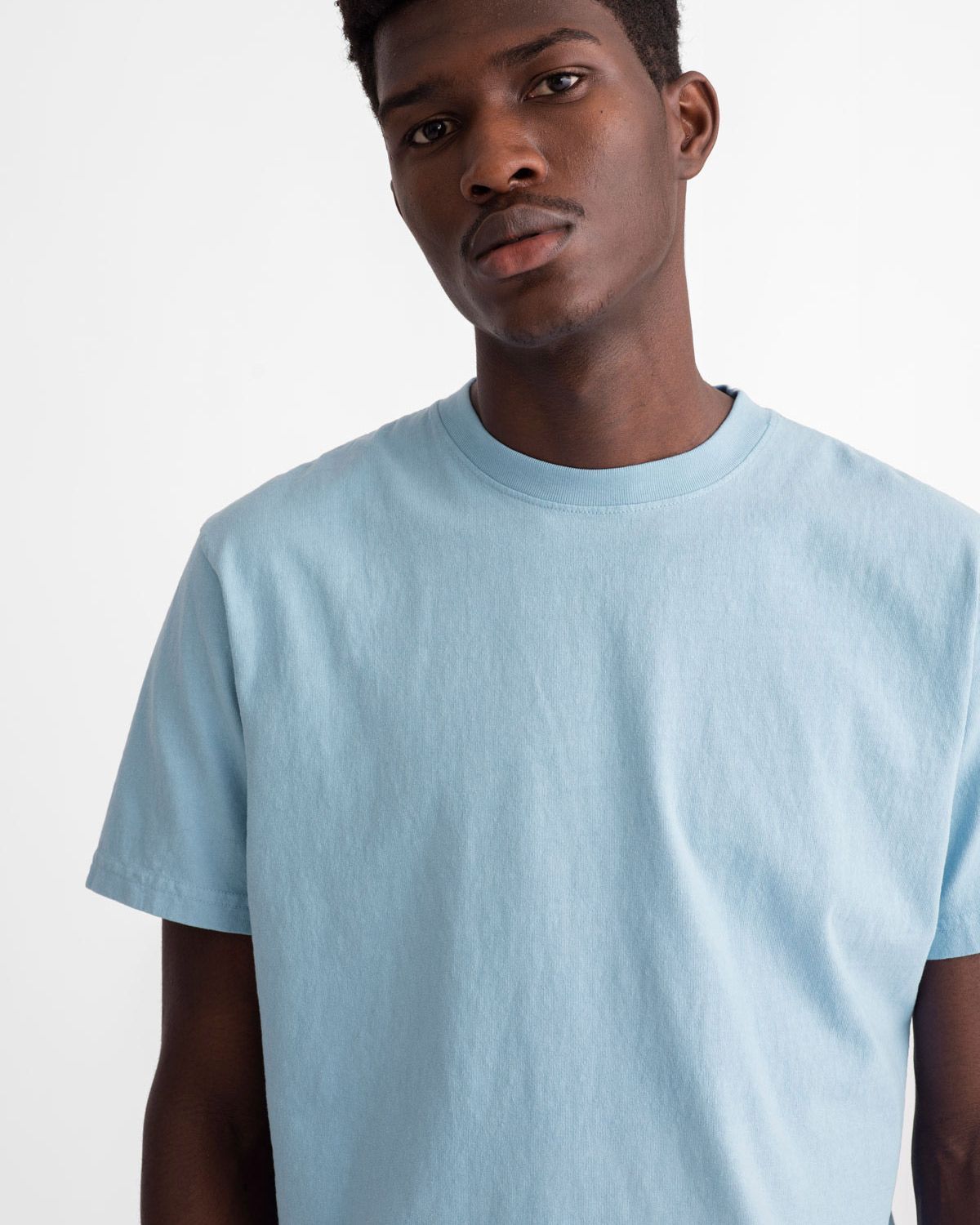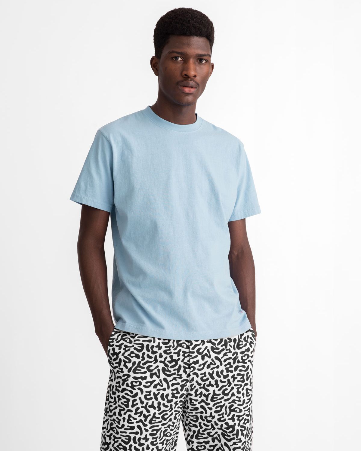 Made in USA. 100% recycled cotton, 6.5-ounce heavyweight jersey. The recycled jersey fabric is soft-to-wear while maintaining a slightly textured hand. It is heavier than our pocket and graphic tees, but not as heavy as our Practice Cloth, with a slightly boxier fit.
