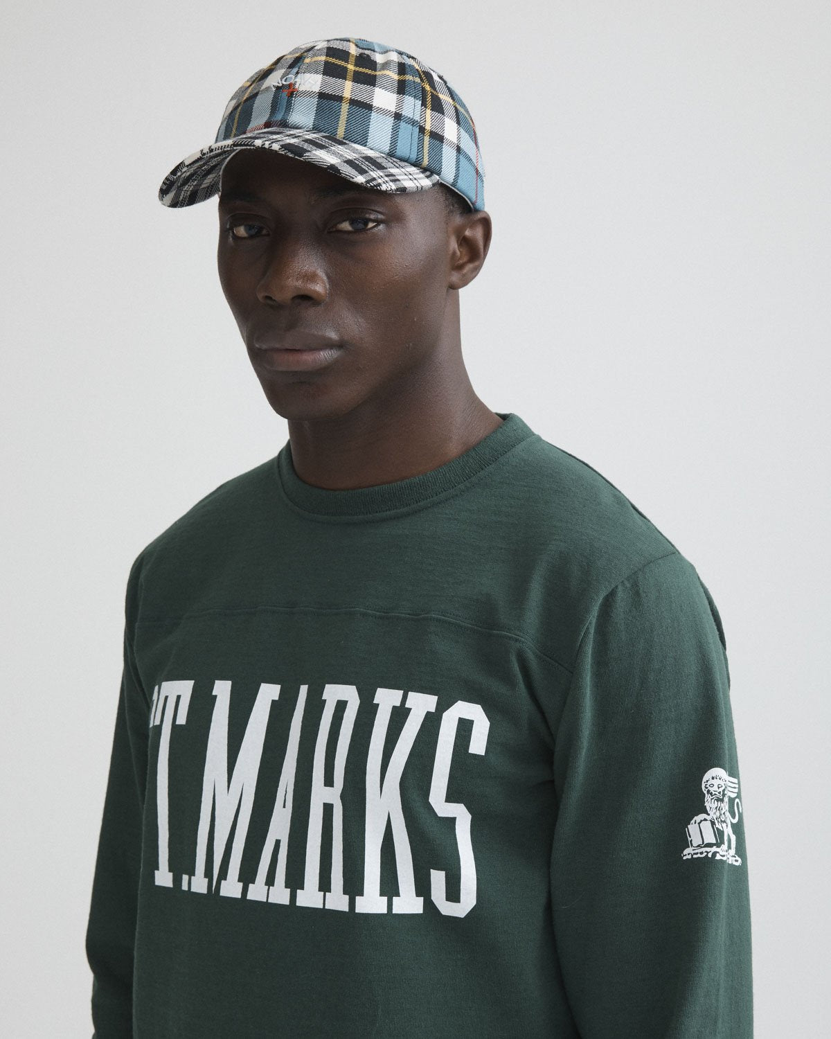 Made in USA. 100% wool with contrast crown and visor. Embroidered graphic on front. Leather strap with brass buckle adjustable closure.