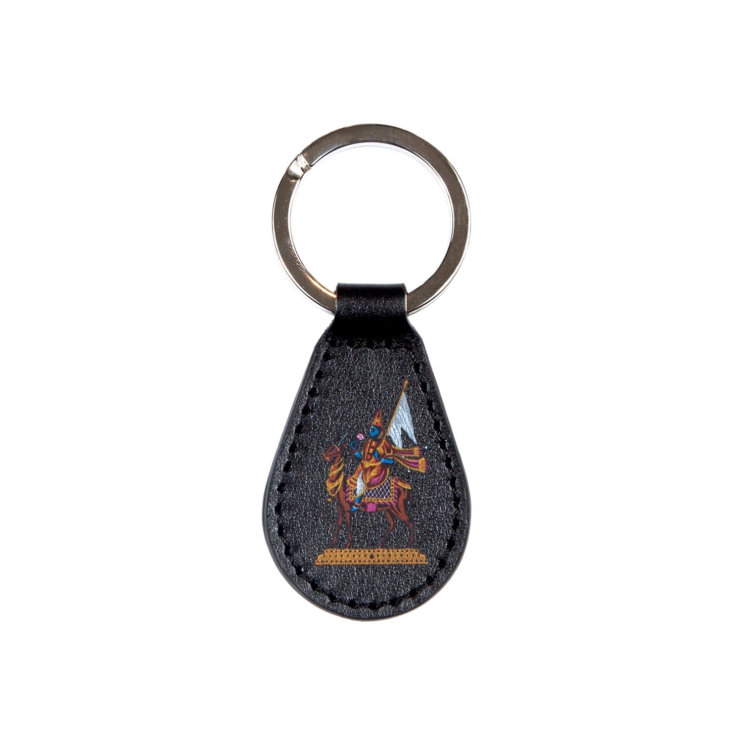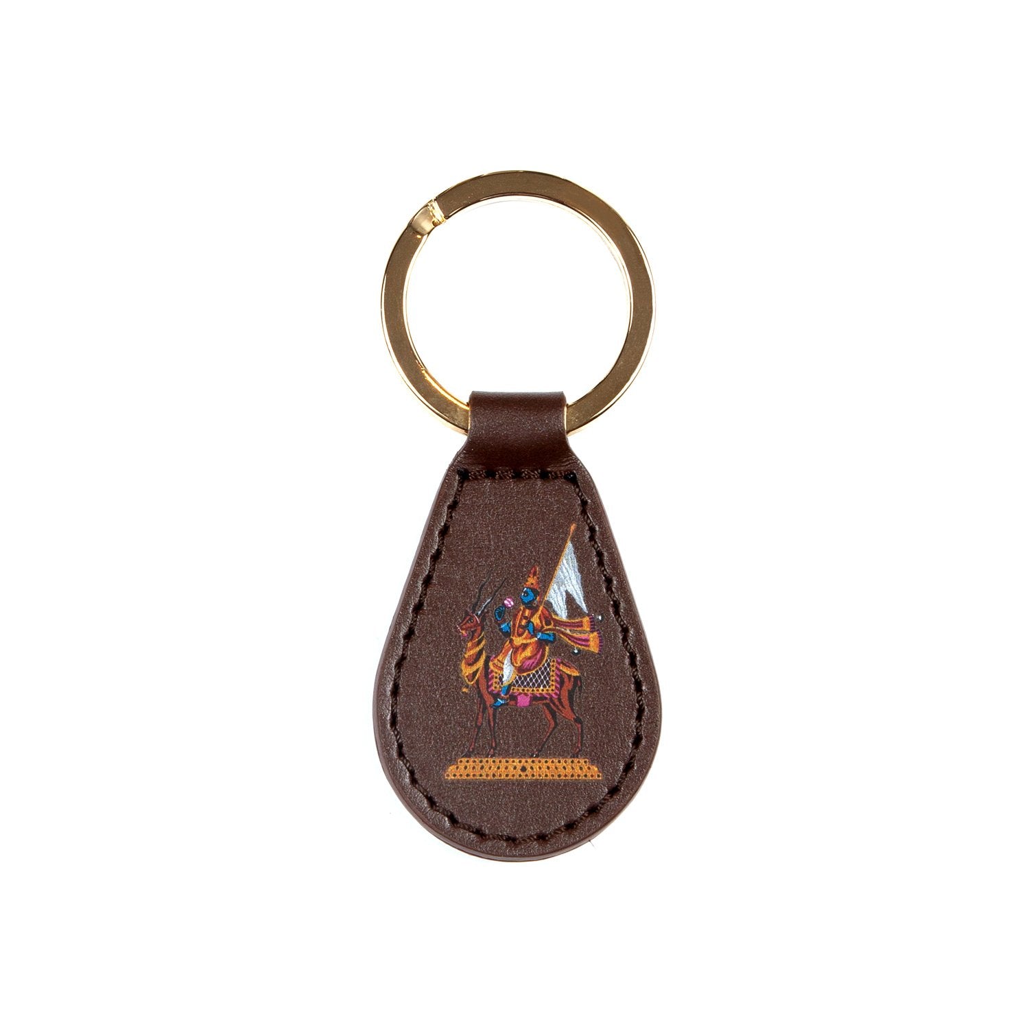 Made in Italy. 100% leather fob with metal 1.25" keyring. Vayu graphic, with embossed logo on back.