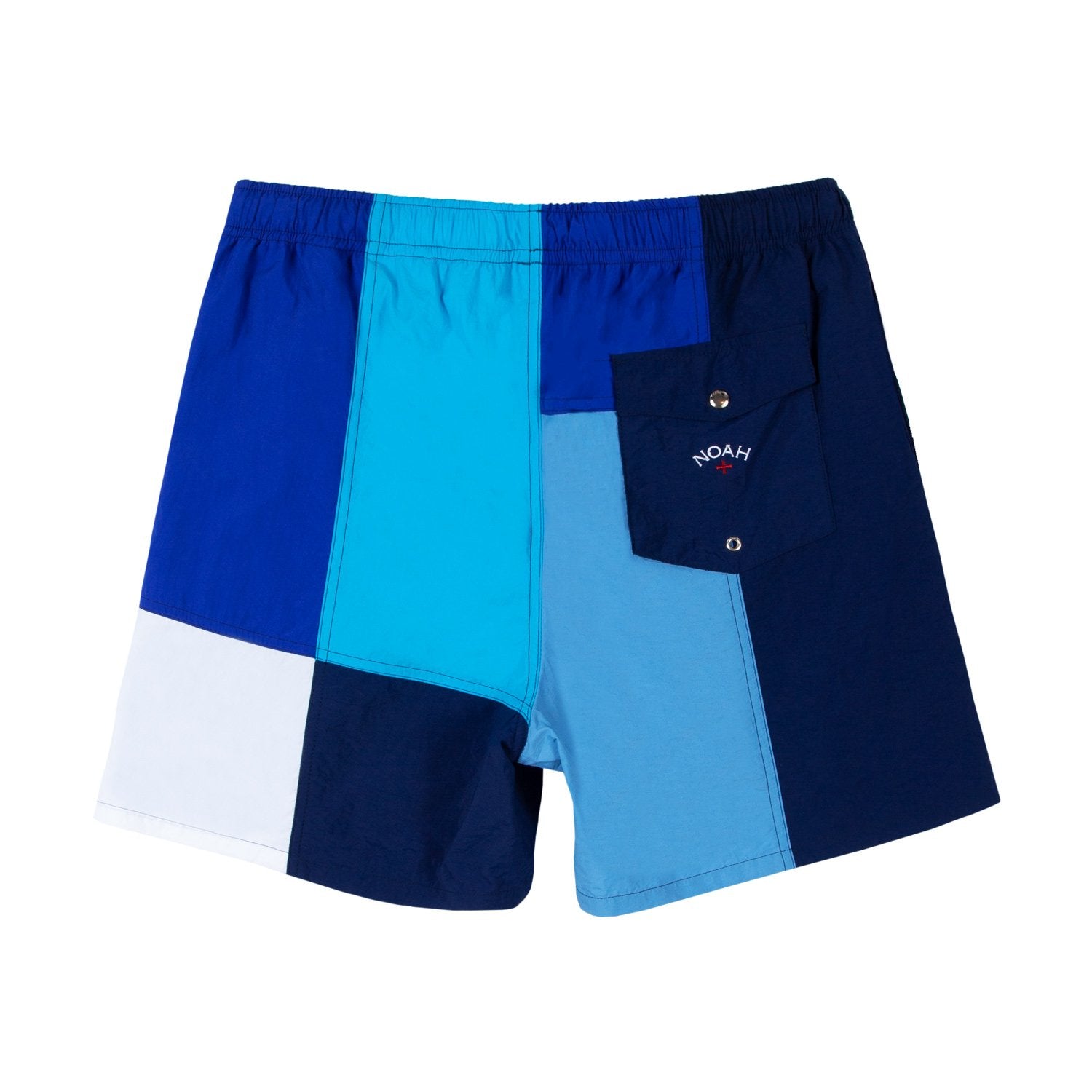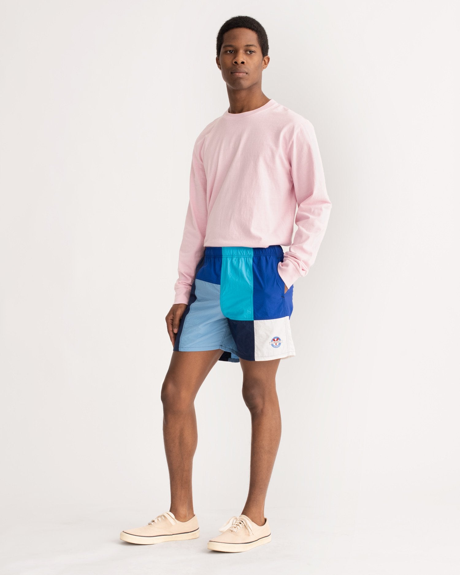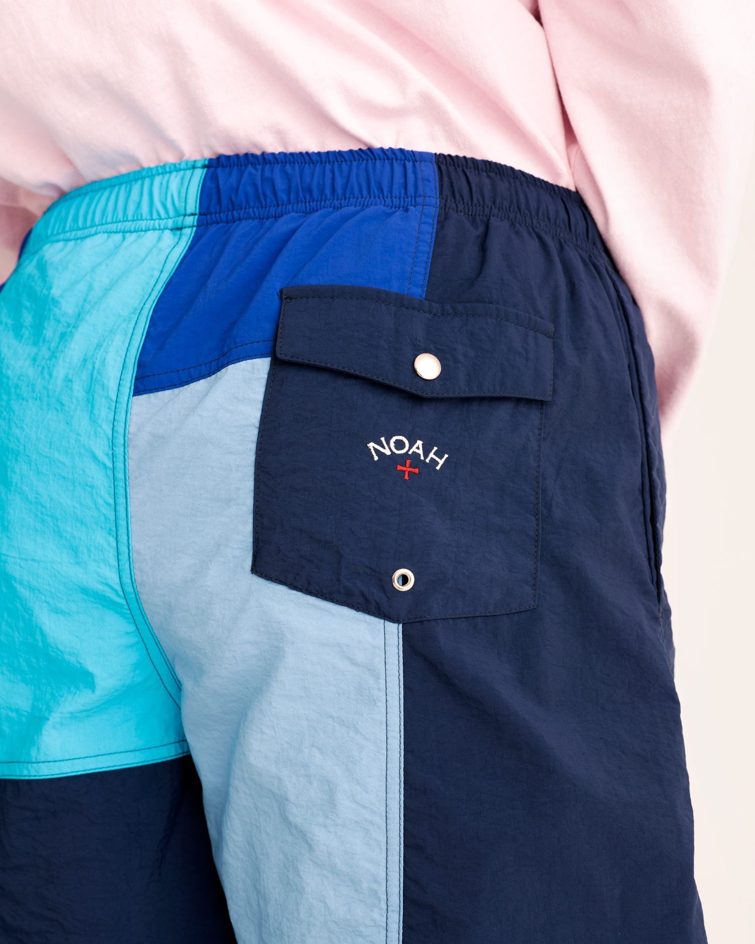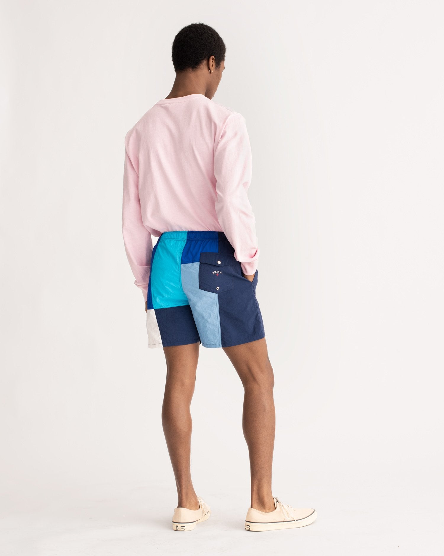 Made in Italy. 100% nylon with poly mesh liner. Cut-and-sewn patchwork panels. Elastic drawsting waist, on-seam front pockets, flap back pocket with snap closure and drain vent. Embroidered logos on thigh and back pocket.