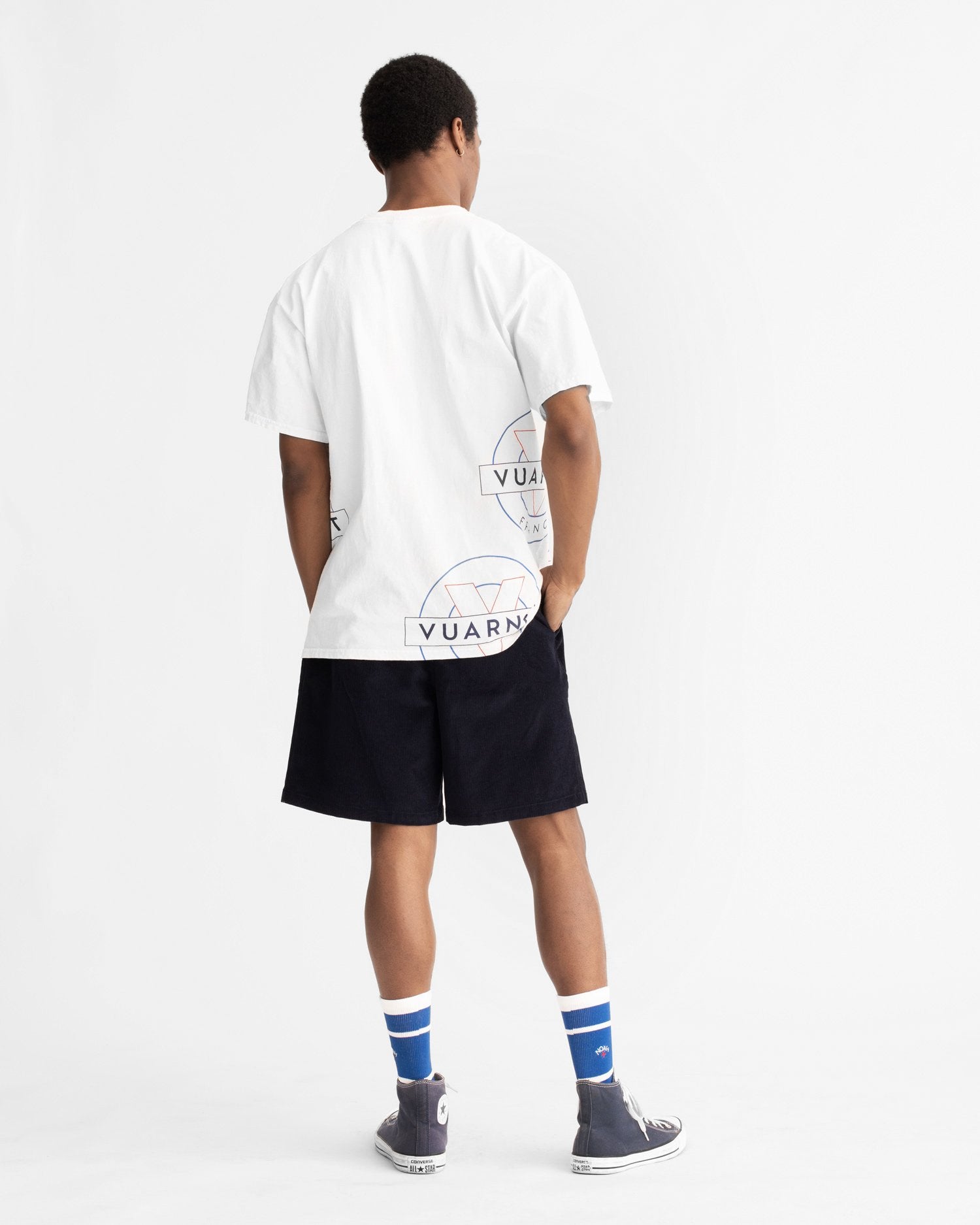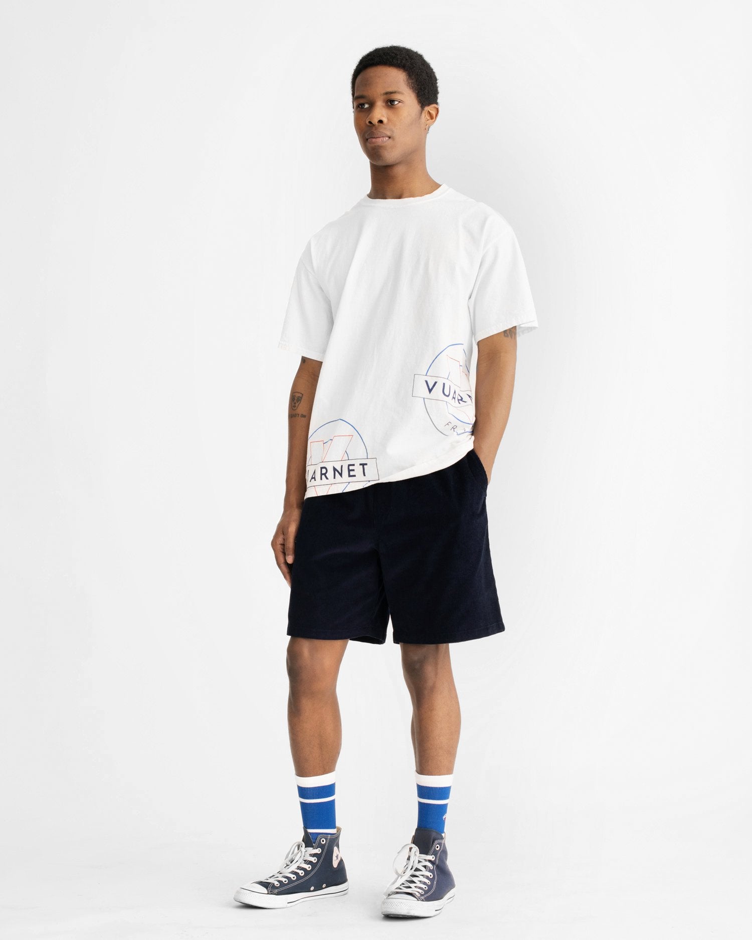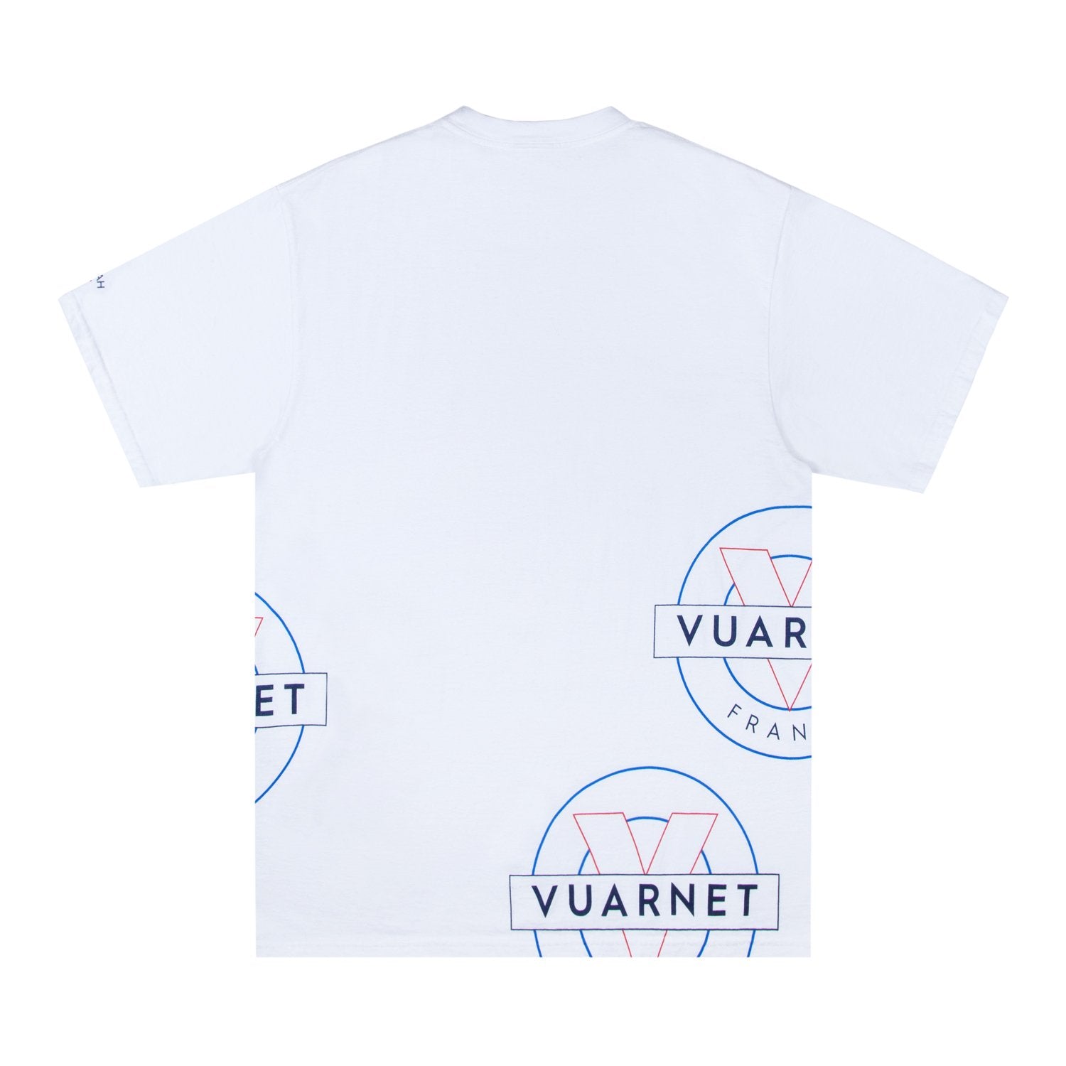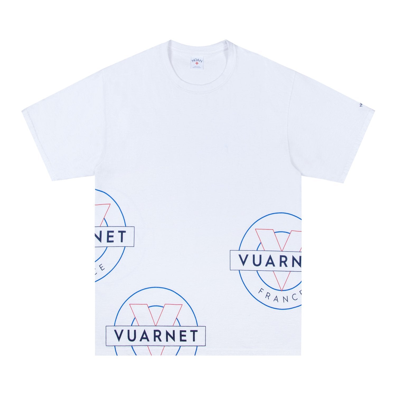 Made in Honduras, printed in USA. 100% cotton. Printed logos on front, back, and sleeve.