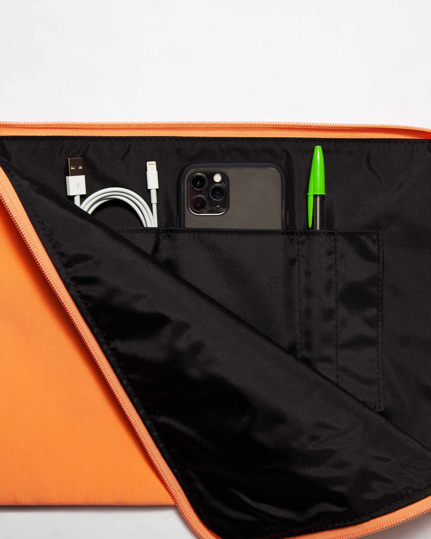 This flat pouch is designed to accommodate a 13" laptop, and its interior pockets can store things like a phone, keys, or pens.
