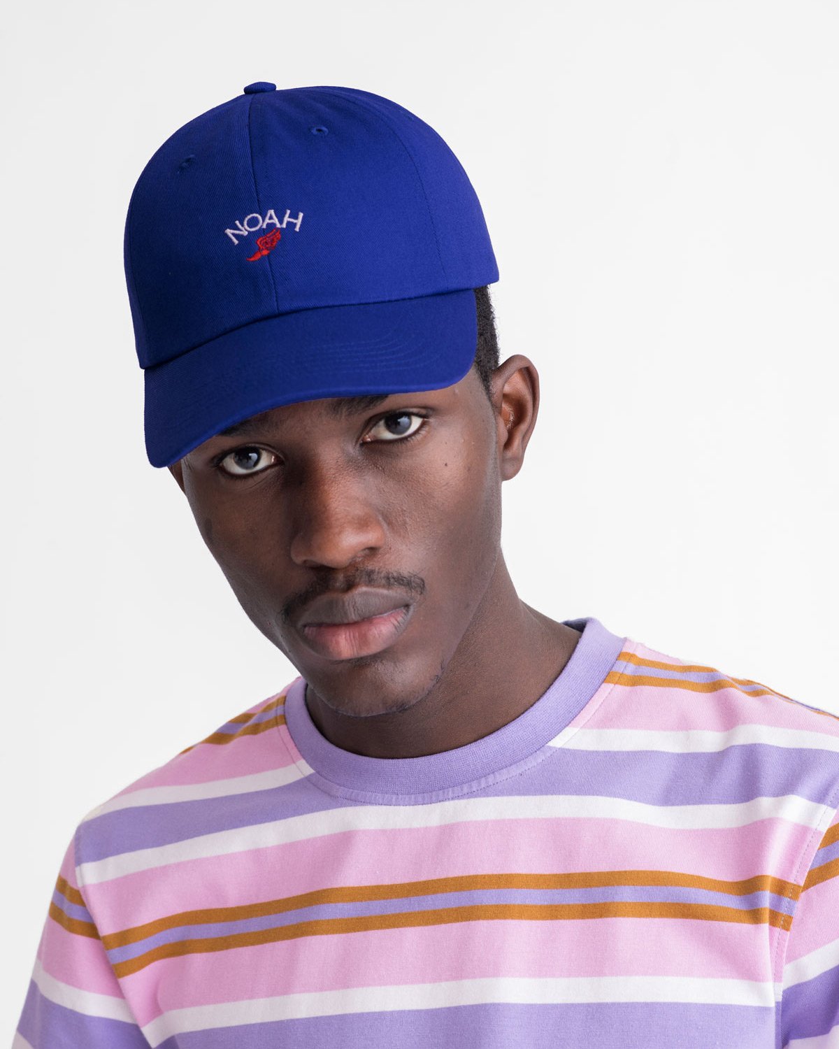 Made in USA. 100% cotton. Self-fabric closure with metal buckle. Embroidered logo on front.